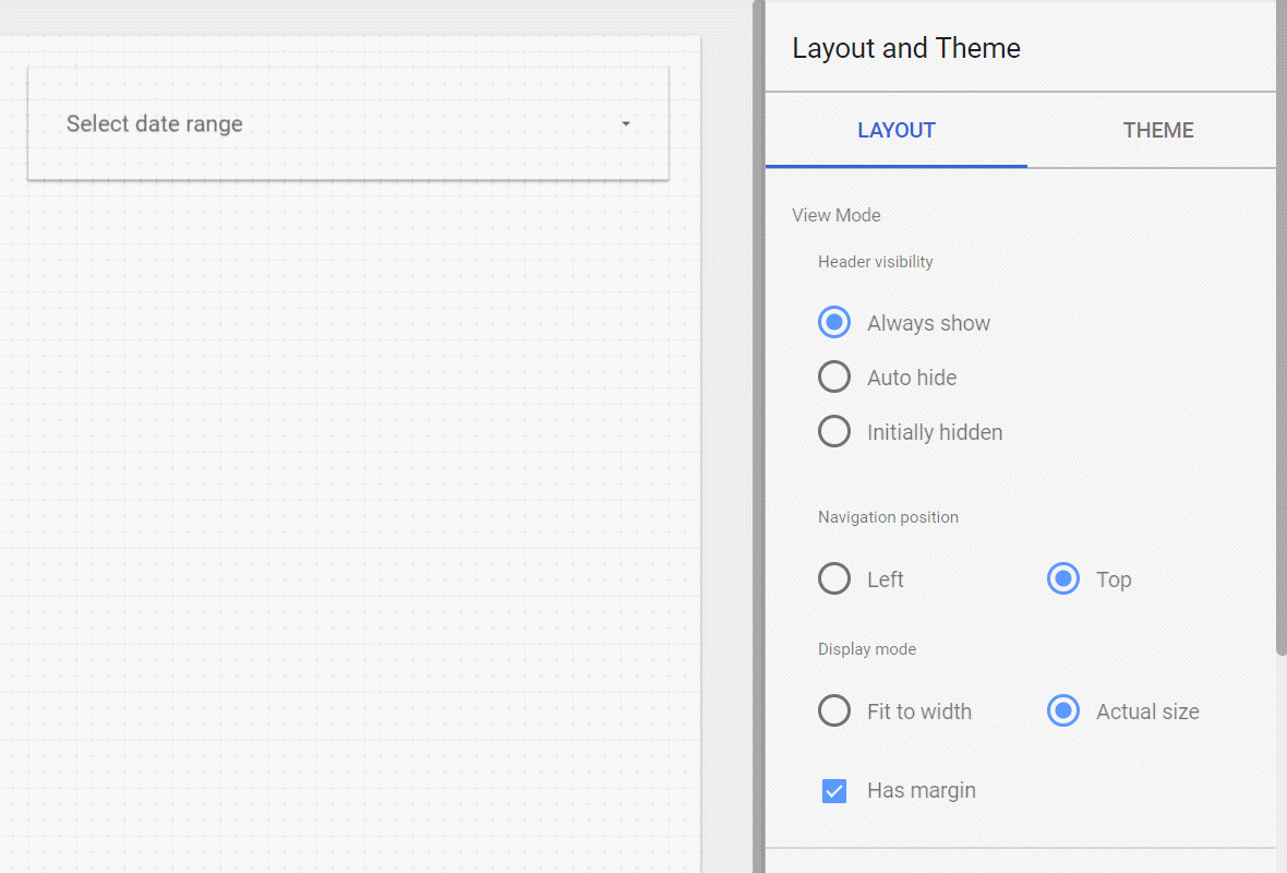 After adding our first data source, we will then see the report editor load up and our blank report ready to go (it should have a nice grid on it). One of the first things to look at is the right-hand panel of "Layout and Theme". This panel provides all the options for customizing the appearance and size of our report. Feel free to play around with the options as you desire, for this article, we’ll just keep all of our default settings as is.